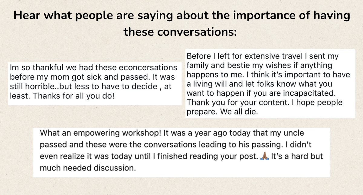 A 2 hour online masterclass that gives you the tools, language, and confidence to talk to aging parents (and other loved ones) about death so you can strengthen your bond, avoid future uncertainty and honor their wishes with love & respect